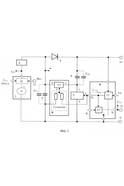 Устройство накопления энергии в конденсаторе относится к области электронной техники и, преимущественно, может быть использовано в специальной технике. Например, в системах управления и приборах (абонентах) космических аппаратов (КА) для устранения однократного пускового импульса тока приборов. В частности, где в цепях первичного источника питания КА с целью повышения помехоустойчивости системы недопустим пусковой ток абонента с амплитудой много больше амплитуды тока абонента в штатном режиме его работы. Техническим результатом является устранение ВЧ помех при включении абонента в цепях первичного источника питания постоянного тока. Особое значение устранение помех имеет в технике специального применения, например, в аппаратуре КА. Использование вместо индуктивности в качестве накопителя энергии конденсатора позволяет сократить ГМХ устройства. При этом электронная часть может быть исполнена в виде кристалла ИМС аналогично СБИС, ГМХ которого по сравнению с ГМХ конденсатора при токе его разряда порядка 10 А…20 А пренебрежимо малы. Энергопотребление устройства определяется практически величиной запасенной энергии W. В режиме хранения W энергопотребление отсутствует.